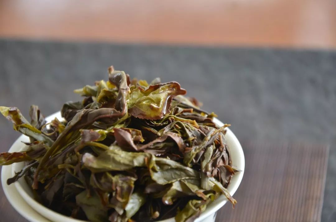 6.将茶渣倒入叶底碗中检查其叶底的发酵程度及柔软程度,看叶片有没有弹性,有没有自然光泽。