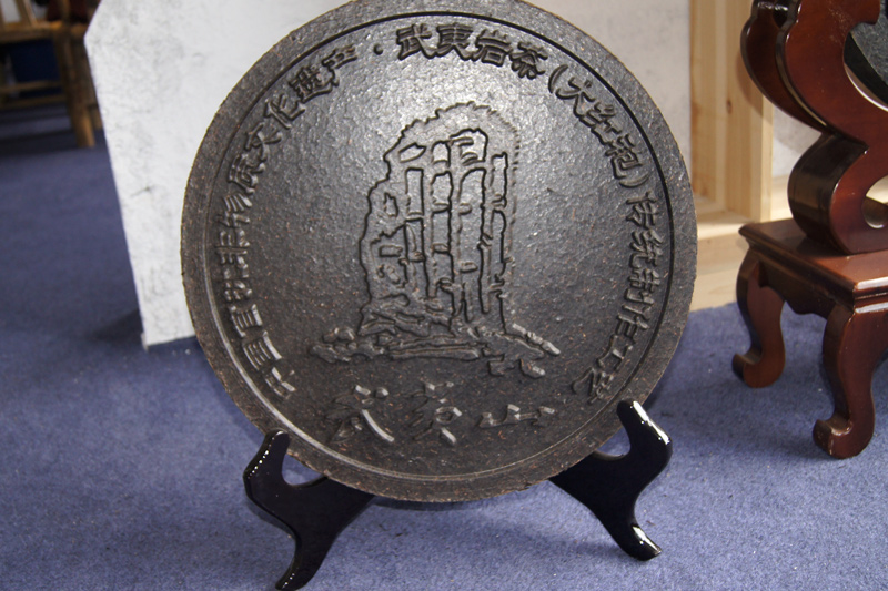 武夷岩茶饼(砖茶):选用的动力机械是油压机,模面压力达50吨以上,模具用失铸成不同规格的圆形,方形。模底内刻有“武夷大红袍“,武夷水仙“ "武夷肉桂”等茶名字样以及山水景物或花鸟之类文饰。岩茶饼原料是用精制岩茶经蒸汽软化后压制干燥而成,因体积大大缩小十分方便运输,更耐贮存且原有品质不减。